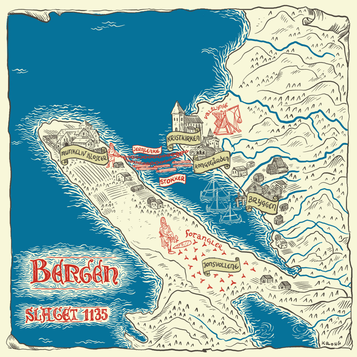 Ukens episode foregår i Bergen, der Magnus og onkelen Harald møtes til et avgjørende slag. Aslak og Ole-Albert gir oss en innføring i militærteknologi på 1100-tallet, før episoden får en ganske makaber slutt for ett av de to kongsemnene. Vinteren 1134/35 forskanset Magnus Sigurdsson seg i Bergen mens han ventet på at erkefiende Harald Gille skulle angripe.