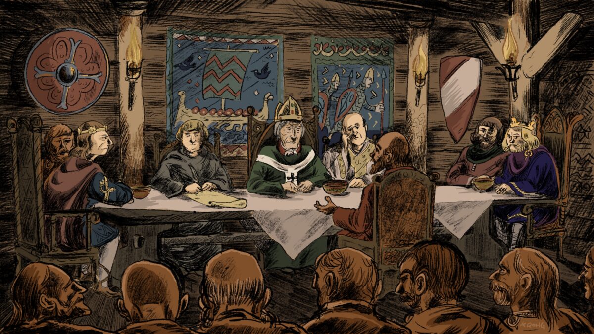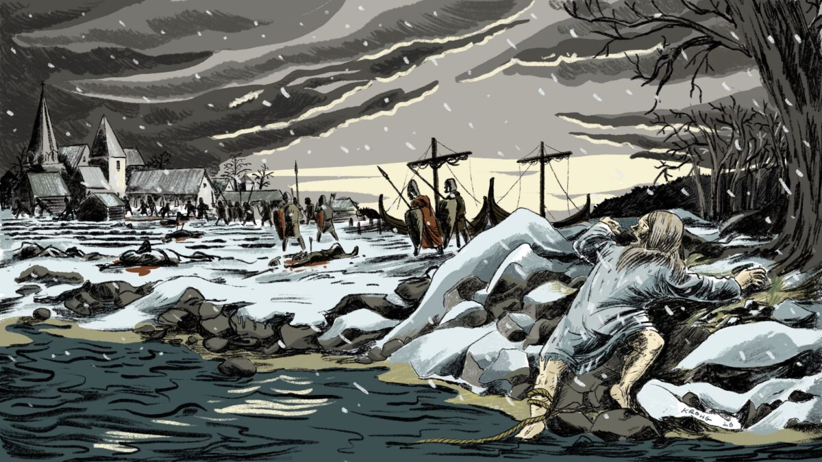 Hva vil det egentlig si å bære jernbyrd? Det diskuterer Aslak og Ole-Albert i denne episoden av «Strid – de norske borgerkrigene», som handler om hva som skjedde da en mann ved navn Harald Gille kom til Norge og hevdet å være kongssønn. Da borgerkrigene brøt ut på begynnelsen av 1100-tallet var Norge større enn det er i dag, med kontroll over Bohuslän, Førøyene, Shetland, Orknøyene og øyene på vestkysten av Skottland. Illustrasjon: Kristian Krohg-Sørensen/byHands