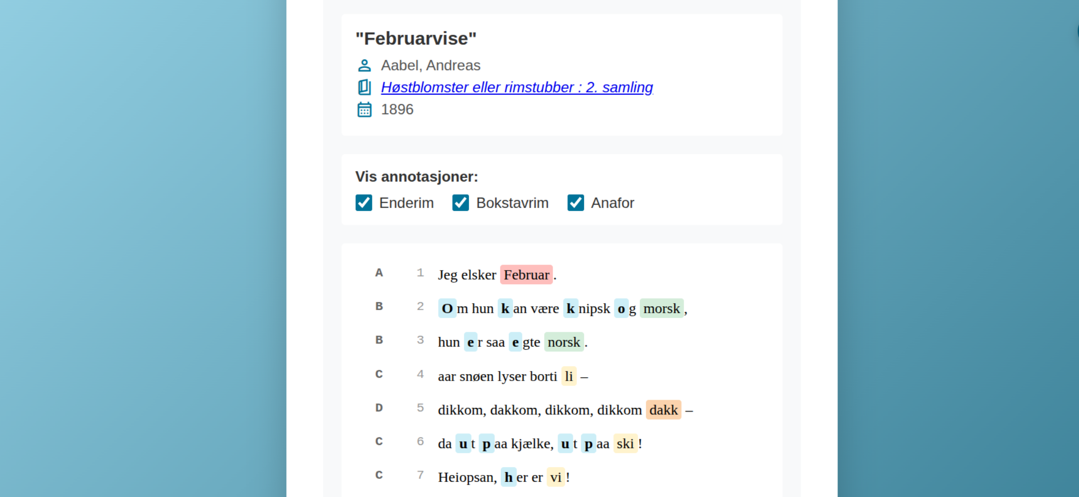 På dette verkstedet kan du blant annet undersøke om det ofte er de samme ordene som rimer på hverandre i enderimsmønstre, om bokstavrim dannes med vokaler eller konsonanter, og hvilke ord som oftest brukes anaforisk.