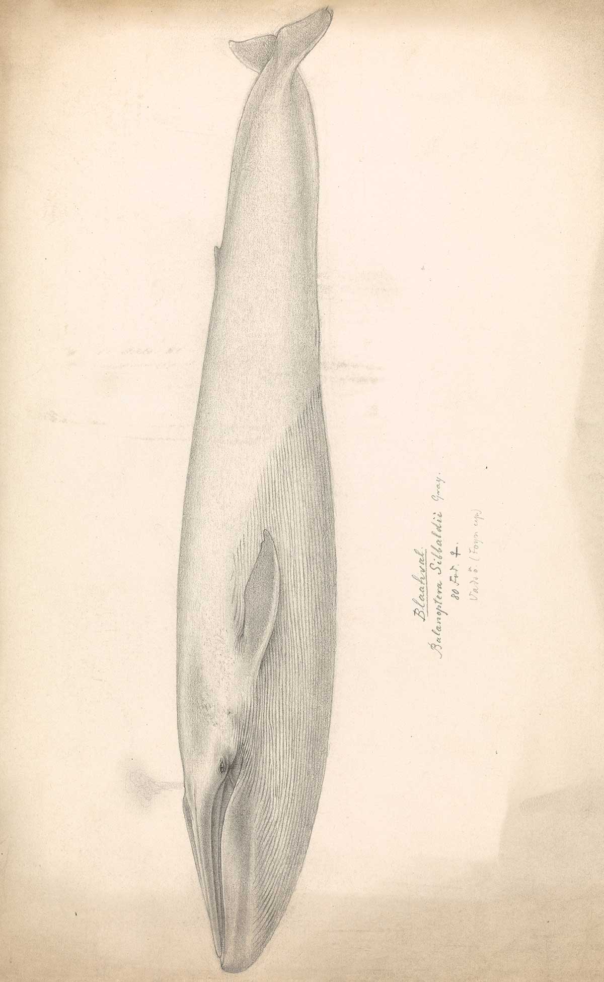 Blåhval (Balaenoptera musculus) tegnet av vitenskapsmannen Georg Ossian Sars (1837–1927).